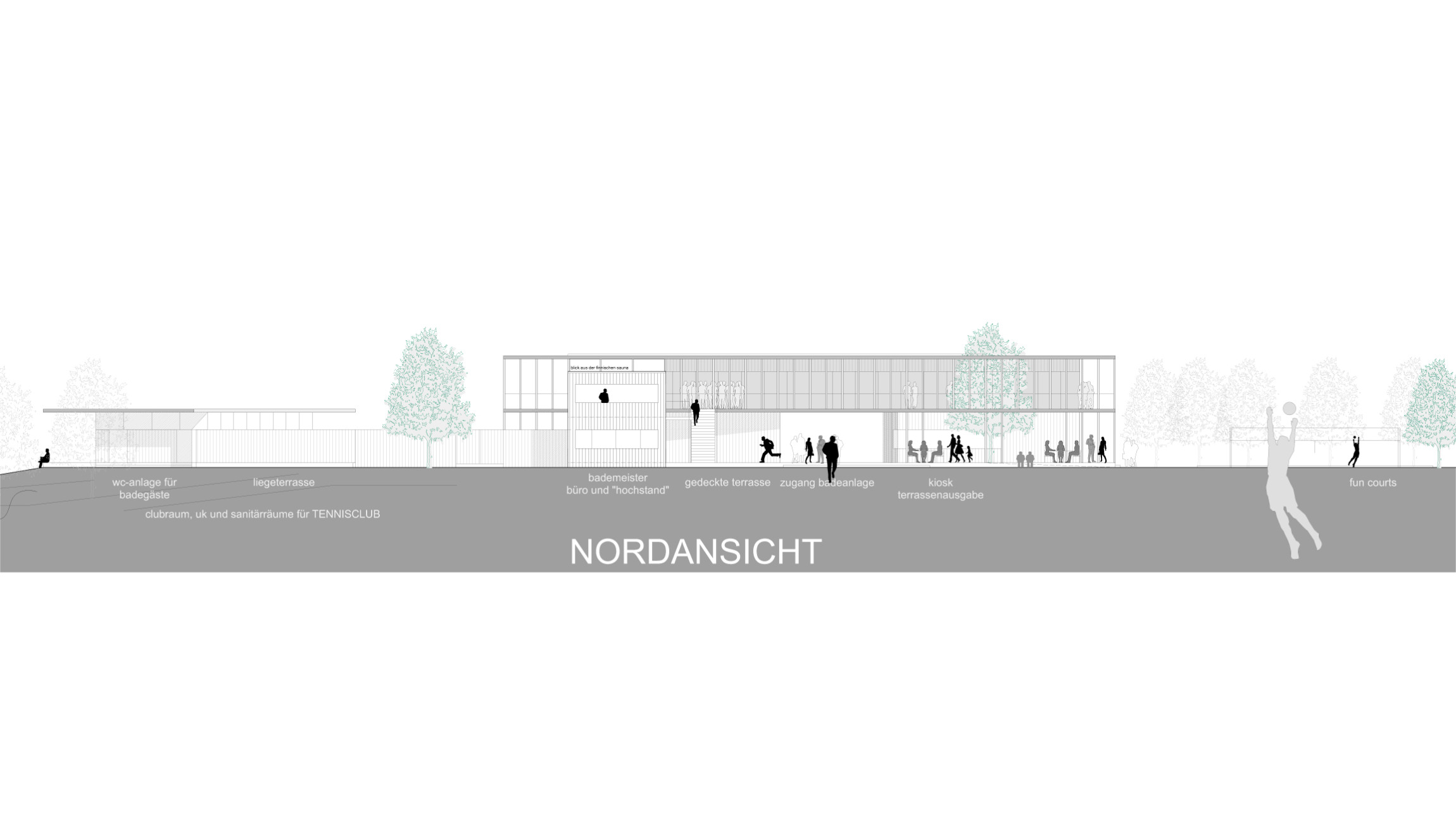 Grundsätzlich versucht das Gesamtprojekt, den bestehenden Rhythmus der Bebauung aufzunehmen. Der umgebenden Struktur entsprechend werden die Baukörper in Baumasse und Ausrichtung entsprechend konzipiert, um eine selbstverständliche, gewachsene städtebauliche Situation zu erzeugen. Das Zentralgebäude orientiert sich einerseits an der Schmalseite des Fußballplatzes und andererseits an den ausgedrehten Linien des Tennisplatzes. So ergibt sich ein Gebäude, dass sich durch seine Form ideal an die Bestandsstruktur anpasst. Die notwendigen Räumlichkeiten für den Tennisclub, wie Clubraum, Sanitär- und Umkleiden sind in einem eigenen erdgeschossigen Gebäude, nahe der Tennisplätze geplant. Durch das Gebäude erreicht man eine selbverständliche Abgrenzung zwischen Badeanlage und Tennisplätze außerdem können so attraktive Liegeplätze auf Holzterrassen zum Bad gerichtet angeboten werden. Um für die Badeanlage weitere Vielfalt an Liegeplätzen zu erhalten, werden im nordseitigen Hang horizontale Liegeflächen nach Süden geschaffen, die in Terrassenform (mit Steinwürfen und Holztreppen) gestaltet sind.